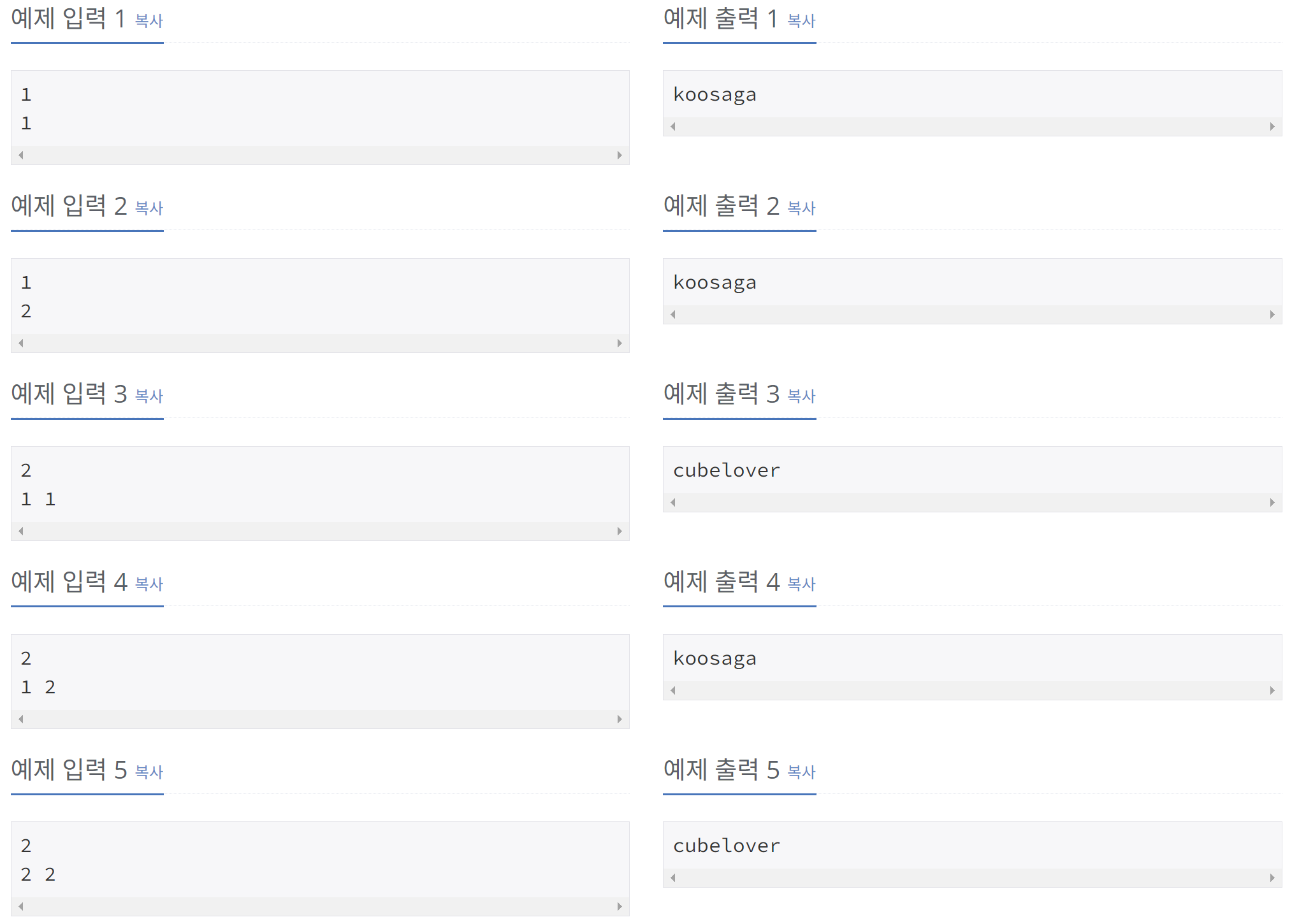 0011 XOR 0011 = 0000(= 1 XOR 2 XOR 3) - 첫 시작은 koosaga이므로 각 돌더미의 개수 XOR 값이 0(이진수로 0000)이면 cubelover가 승리하고, 0이 아니면 koosaga가 승리한다.