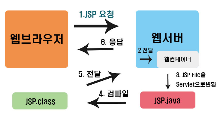 - 사용자의 요청을 받은 웹 서버는 해당 페이지를 처리하기 위해서 JSP 컨테이너(JSP 또는 서블릿)에 처리를 넘긴다.