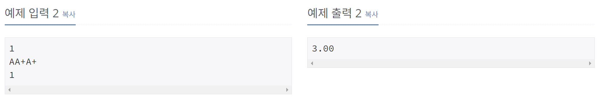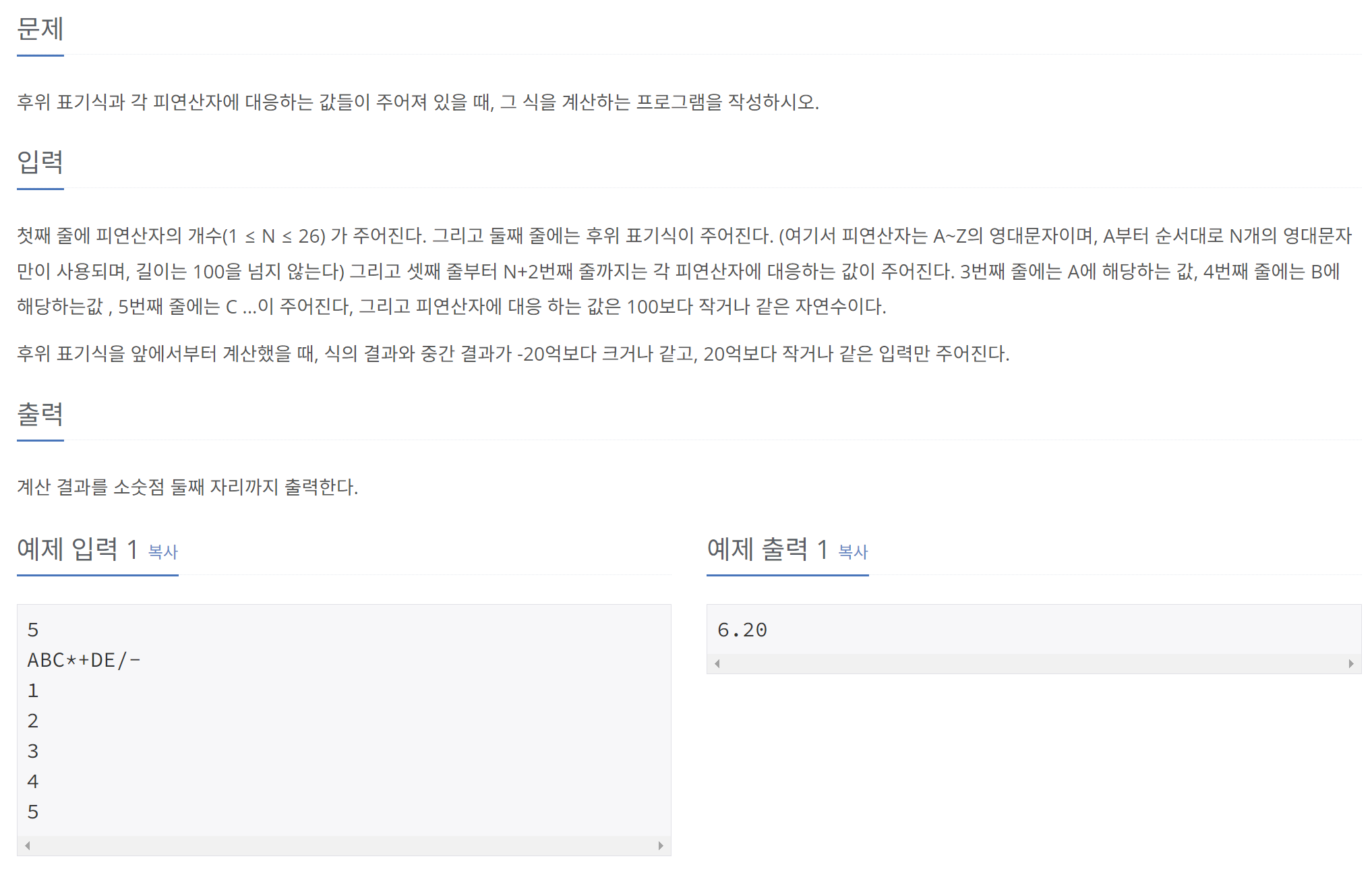 - 입력의 두 번째 줄에 주어지는 알파벳과 3번째 줄부터 주어지는 피연산자들의 매핑 관계를 만들기 위해 해시테이블을 사용하였다.