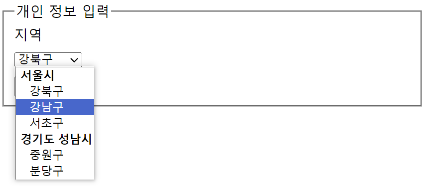 콤보박스에 항목을 하나 추가할 때는 option 태그를 사용하고, 항목들을 그룹으로 묶고 싶다면 optgroup 태그를 사용한다.