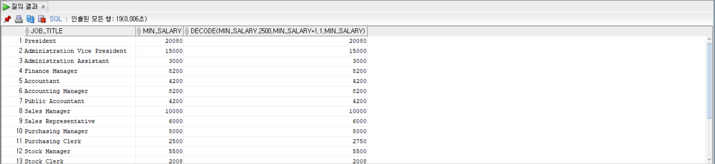 DECODE(min_salary, 2500, min_salary * 1.1, min_salary)