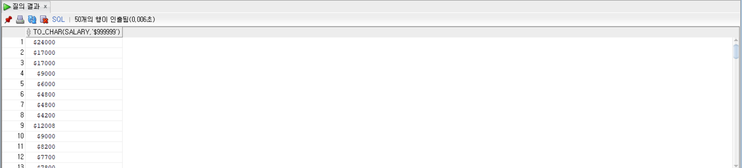 SELECT TO_CHAR(salary, '$999999') FROM employees;