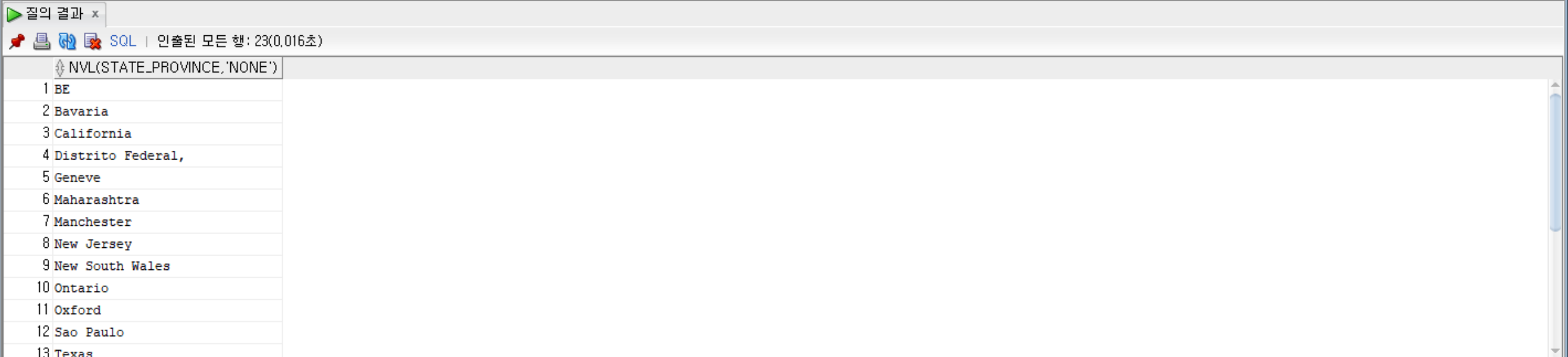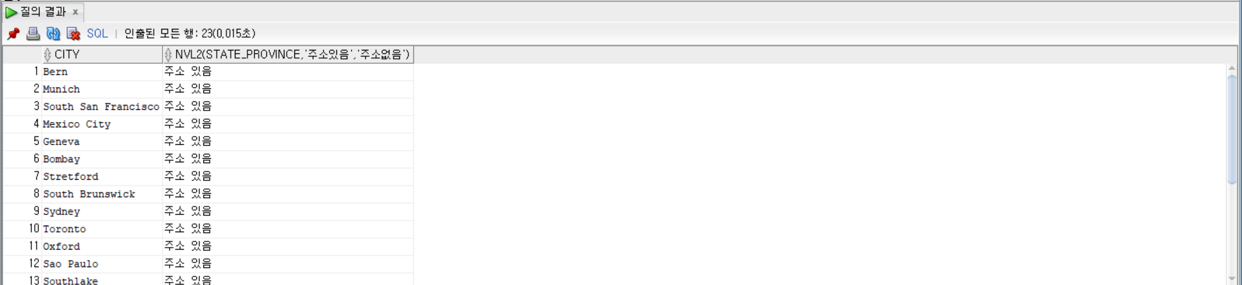 SELECT city, NVL2(state_province, '주소 있음', '주소 없음') FROM locations ORDER BY state_province;