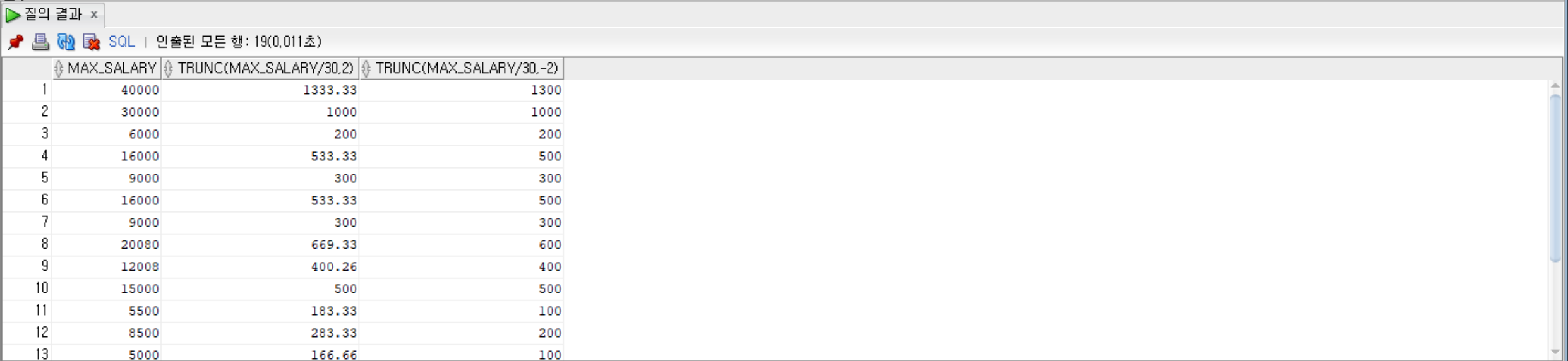 SELECT max_salary, TRUNC(max_salary / 30, 2), TRUNC(max_salary / 30, -2) FROM jobs;