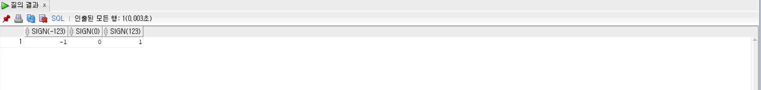 SELECT SIGN(-123), SIGN(0), SIGN(123) FROM dual;