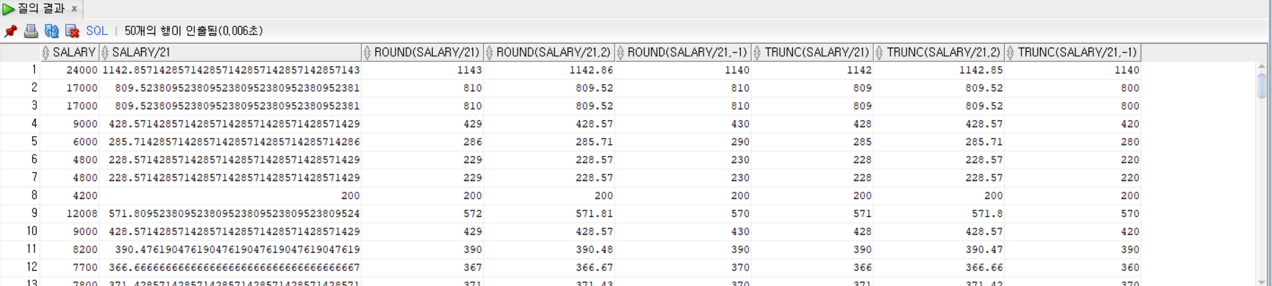 TRUNC(salary/21), TRUNC(salary/21, 2), TRUNC(salary/21, -1)