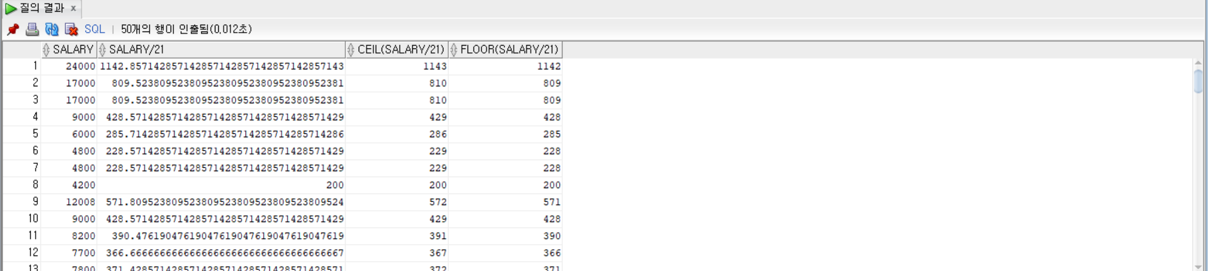 SELECT salary, salary/21, CEIL(salary/21), FLOOR(salary/21) FROM employees;