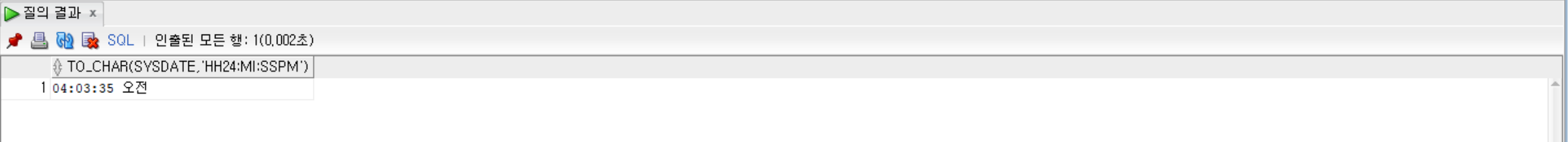 SELECT TO_CHAR(SYSDATE, 'AM HH:MI:SS') FROM dual;