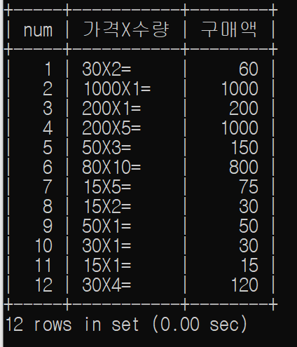 SELECT num, CONCAT(CAST(price AS CHAR), 'X', CAST(amount AS CHAR) ,'=' ) '가격X수량',