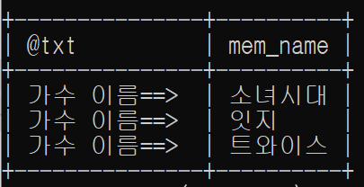 SET @txt = '가수 이름==> ' ;