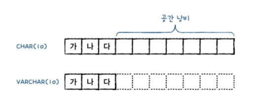 예를 들어 CHAR(10)에 '가나다' 3글자만 저장해도 10자리를 모두 확보한 후에 앞에 3자리를 사용하고 뒤의 7자리는 낭비하게 된다.