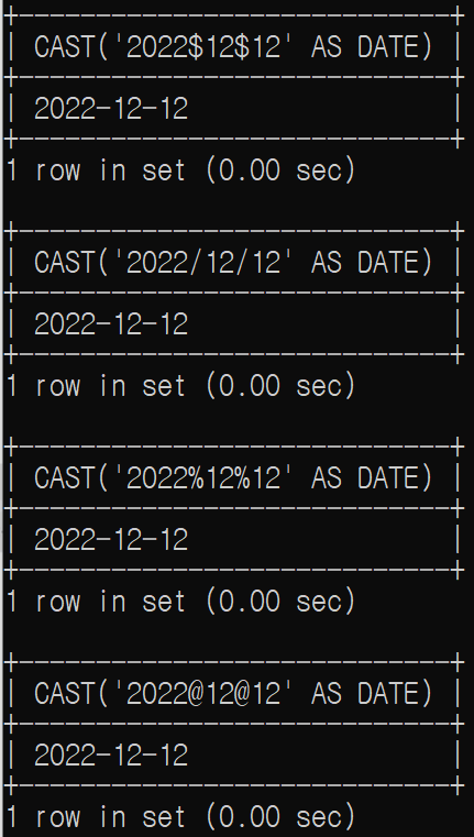 CAST()나 CONVERT() 함수 안에 올 수 있는 데이터 형식은 CHAR, SIGNED, UNSIGNED, DATE, TIME, DATETIME 등이다.