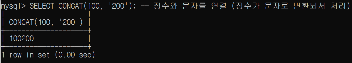 SELECT CONCAT(100, '200'); -- 정수와 문자를 연결 (정수가 문자로 변환되서 처리)