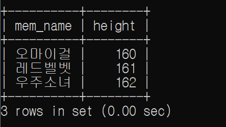 SELECT @txt , mem_name FROM member WHERE height > @height ;