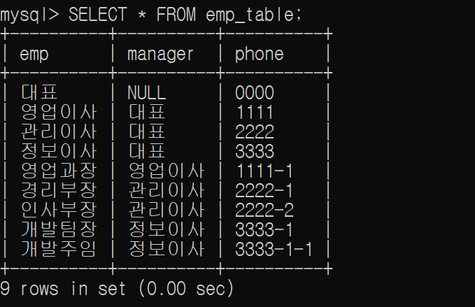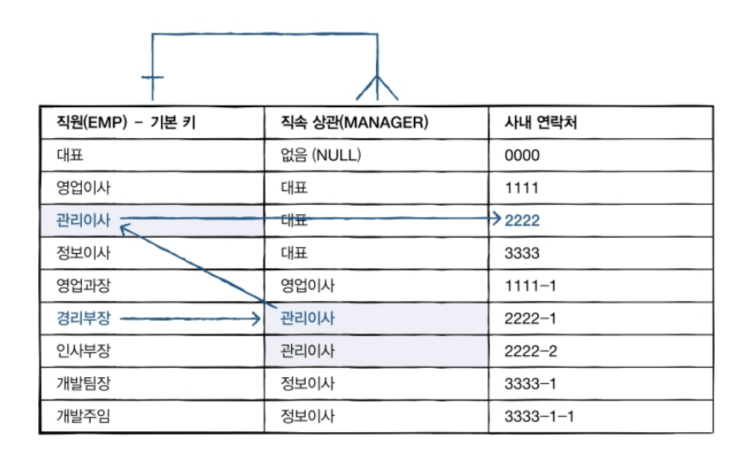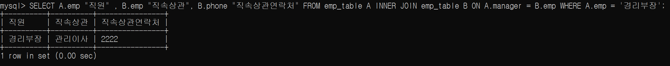 만약, 직원 중 경리부장의 직속상관인 관리이사의 사내 연락처를 알고 싶다면 EMP열과 MANAGER 열을 조인해야 한다.