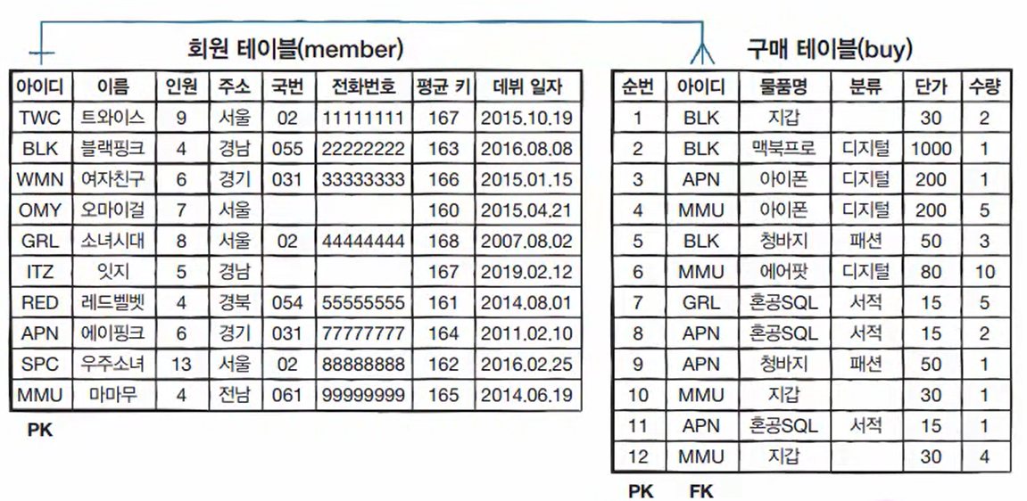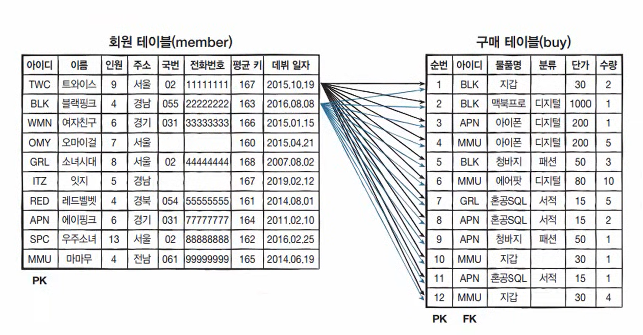 이러한 대표적인 사례가 인터넷 마켓 데이터베이스(market_db)의 회원 테이블과 구매 테이블이다.