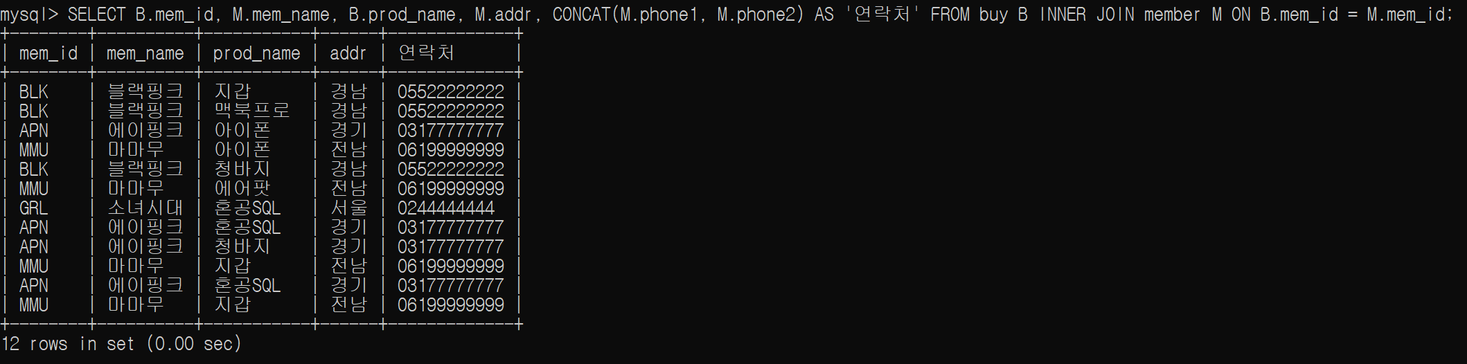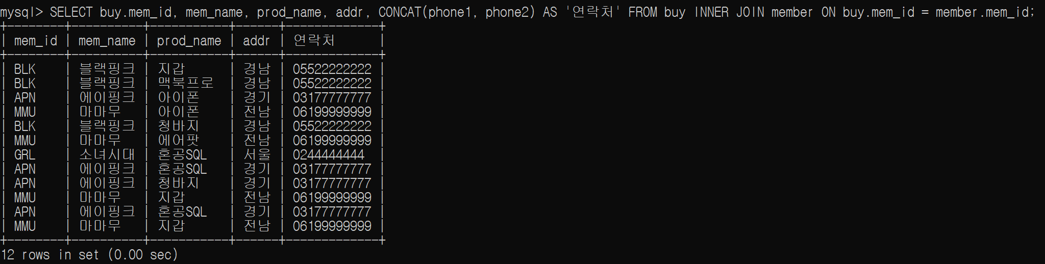 SELECT buy.mem_id, mem_name, prod_name, addr, CONCAT(phone1, phone2) AS '연락처'