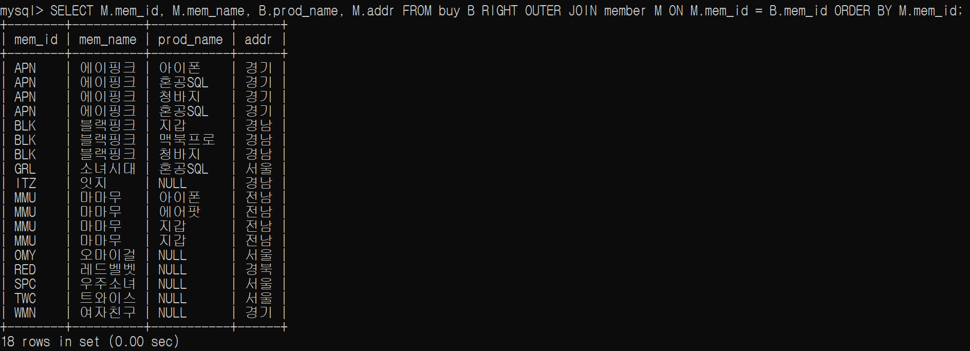 즉, 구매 테이블의 모든 행이 회원 테이블과 결합이 된다.