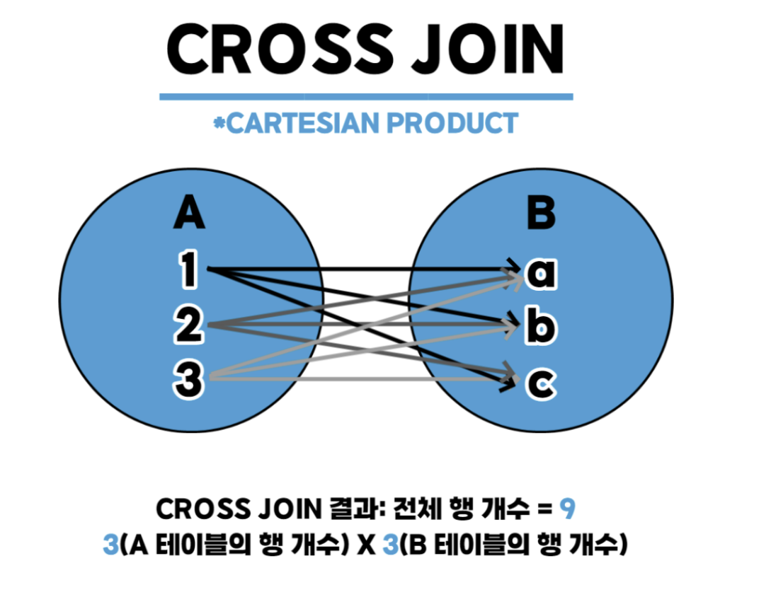 이런 식으로 회원 테이블의 모든 행이 구매 테이블의 모든 행과 결합된다.