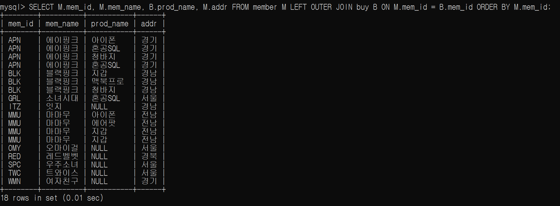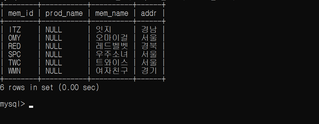 이렇게 쿼리를 작성하면, 구매 테이블과 회원 테이블이 mem_id를 기준으로 결합이 된다.