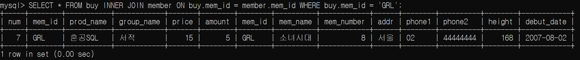 구매 테이블에서 GRL이라는 아이디를 가진 사람이 구매한 물건을 발송하기 위해 아래와 같이 조인해서 이름/주소/연락처 등을 검색할 수 있다.
