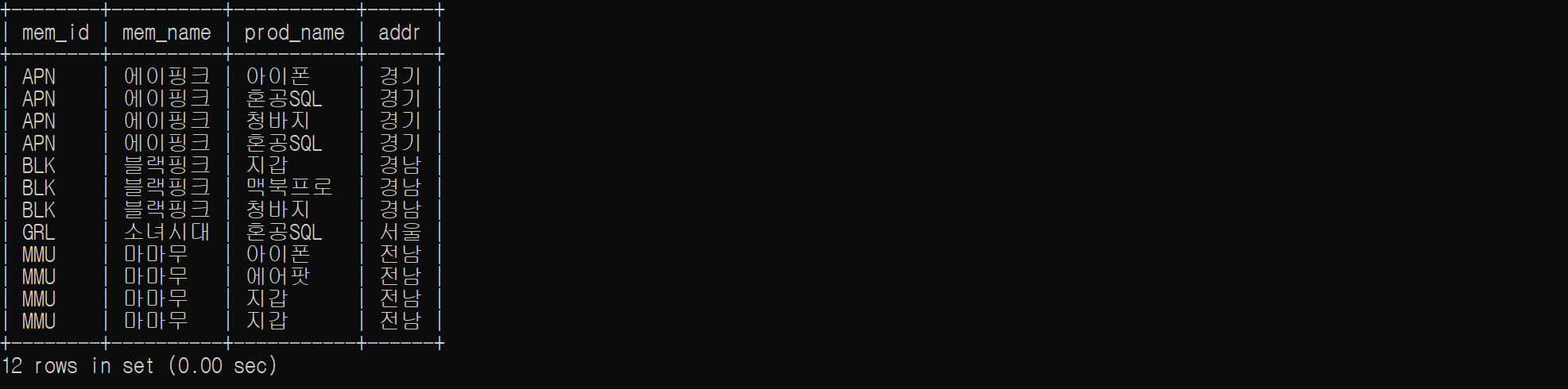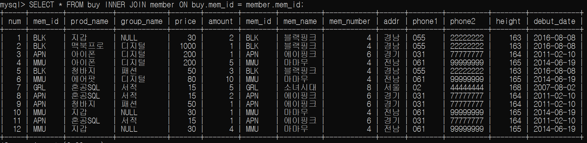 즉, 회원 테이블의 첫 행이 구매 테이블의 12개 행과 결합된다.