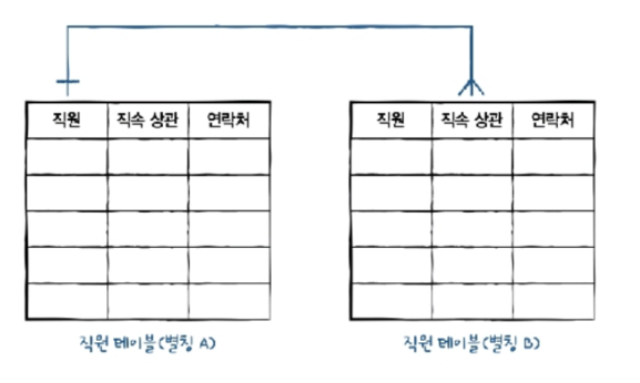 인터넷 마켓 데이터베이스의 회원 테이블과 구매 테이블을 예로 들 수 있다.