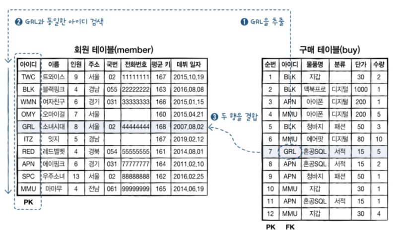 회원 테이블에는 회원의 이름과 연락처가 있고, 구매 테이블에는 회원이 구매한 물건이 있다.