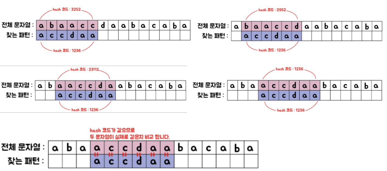 찾는 패턴의 길이만큼을 전체 문자열과 찾는 문자열의 해시 코드로 비교한다.