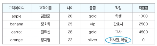물론 현실에서는 직업이 둘 이상인 고객이 존재할 수 있지만, 관계 데이터 모델은 이런 복잡한 개념을 배제하고 릴레이션을 단순한 구조로 정의하고자 하는 특징이 있어 다중 값을 허용하지 않는다.