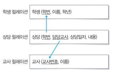 즉, 다른 릴레이션의 기본키를 그대로 참조하는 속성의 집합이 외래키다.