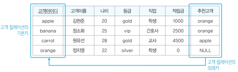즉, 외래키 자신이 속한 릴레이션의 기본키를 참조하도록 외래키를 정의할 수도 있다.