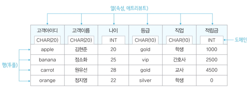 테이블은 행과 열로 이루어진 데이터 구조이다. 각 테이블은 여러 개의 열(속성 또는 필드)과 이에 해당하는 데이터 레코드(행)로 구성된다.