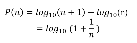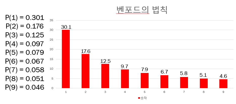 식의 결과 값과 벤포드의 법칙의 각 숫자 비율과 똑같은 것을 알 수 있다.