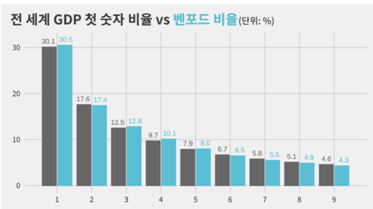 뿐만아니라 전 세계의 GDP 첫 숫자 비율과 벤포드 비율이 거의 유사하다.