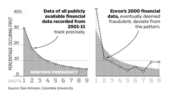 기업들의 회계 데이터를 분석하면 벤포드의 법칙을 그대로 따르는데, 반대로 이법칙을 이용하면 회계장부를 조작한 기업을 적발할 수 있다.