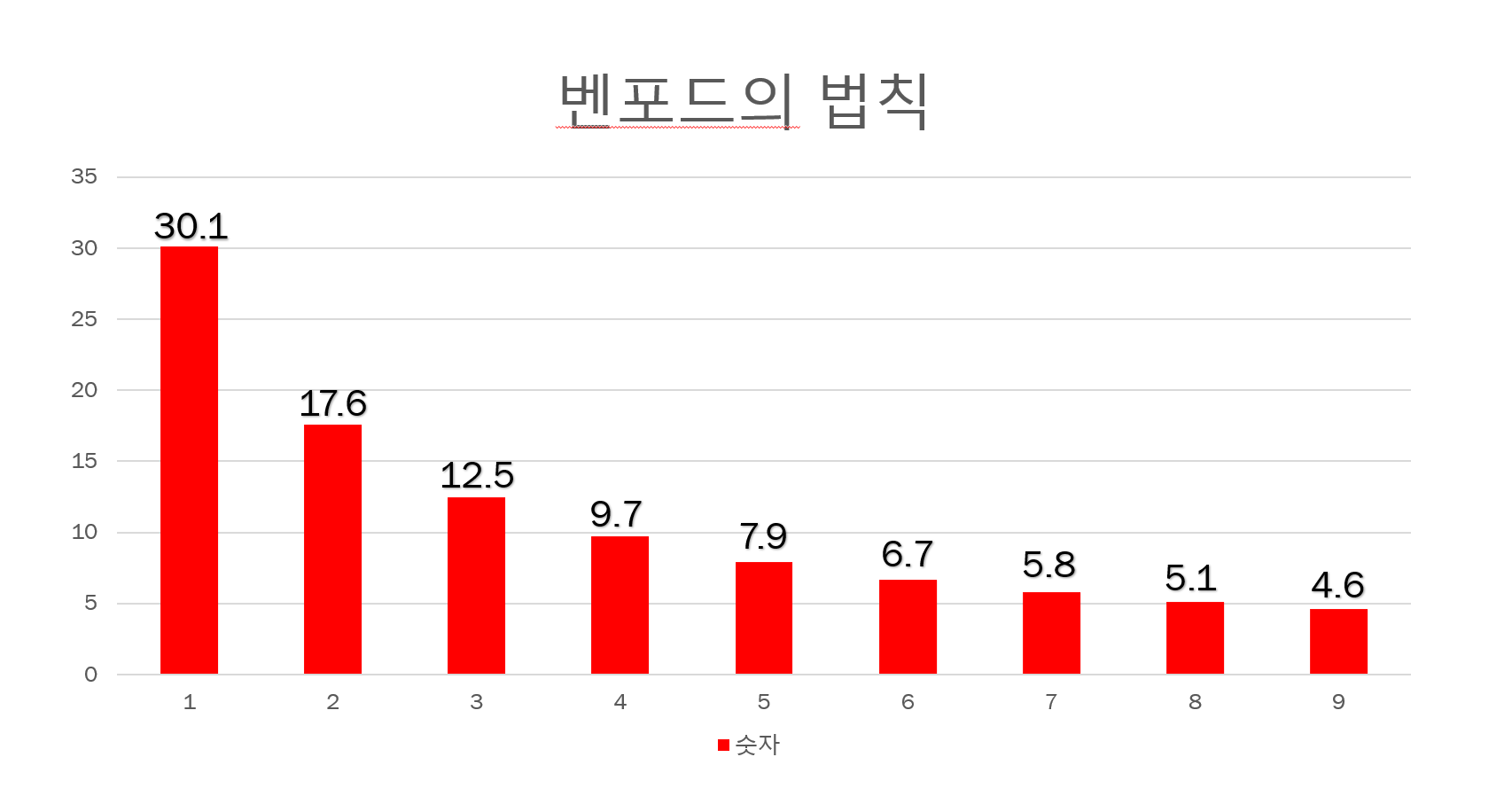 이렇게 여러개의 데이터를 뽑으면 1~9까지 수중에서 각 숫자가 사용될 확률이 11.11%가 아니라 1이 가장 많이 사용된다는 법칙