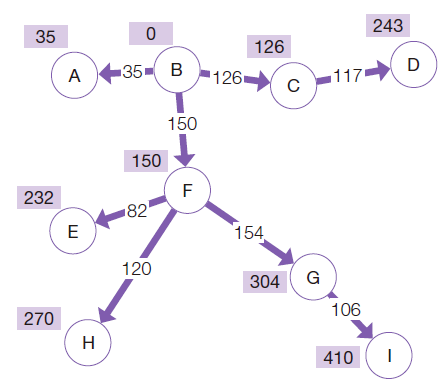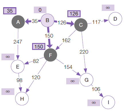 각 정점의 상단에 있는 상자 속 값들은 B에서부터 해당 정점에 이르는 경로상 모든 간선의 가중치이다.