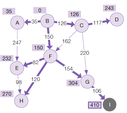I의 현재 경로 길이는 무한대이므로 경로 B-F-G-I의 비용 410을 입력한다.