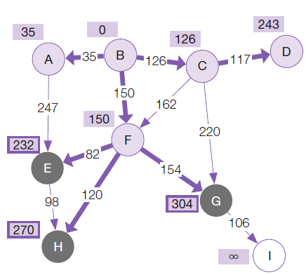 E에 인접한 정점 H가 있기는 하지만 경로 B-F-E-H의 비용이 330이고 현재 경로(B-F-H) 길이 270보다 크므로 무시한다.
