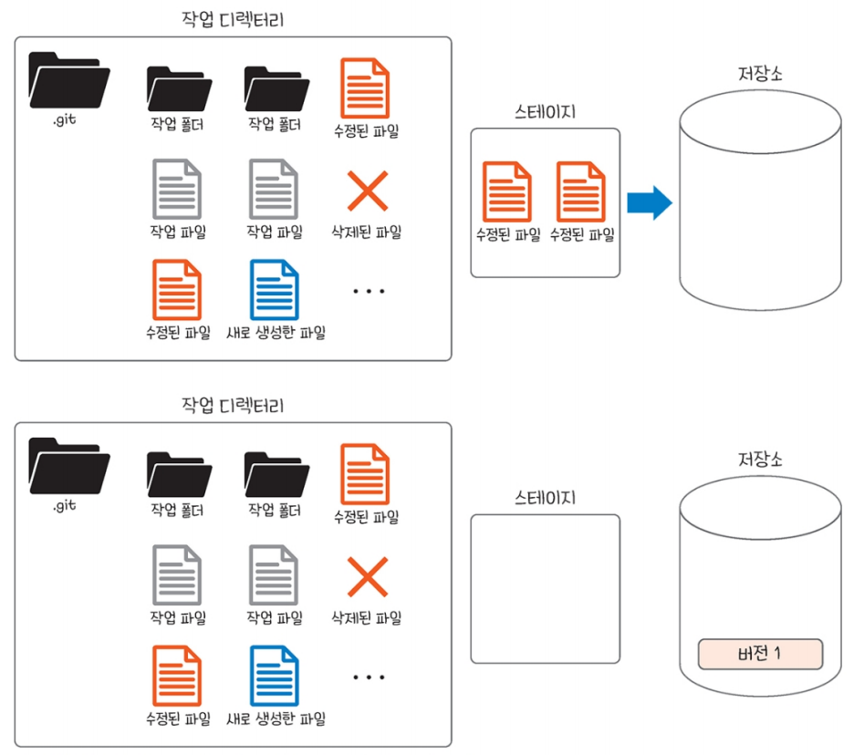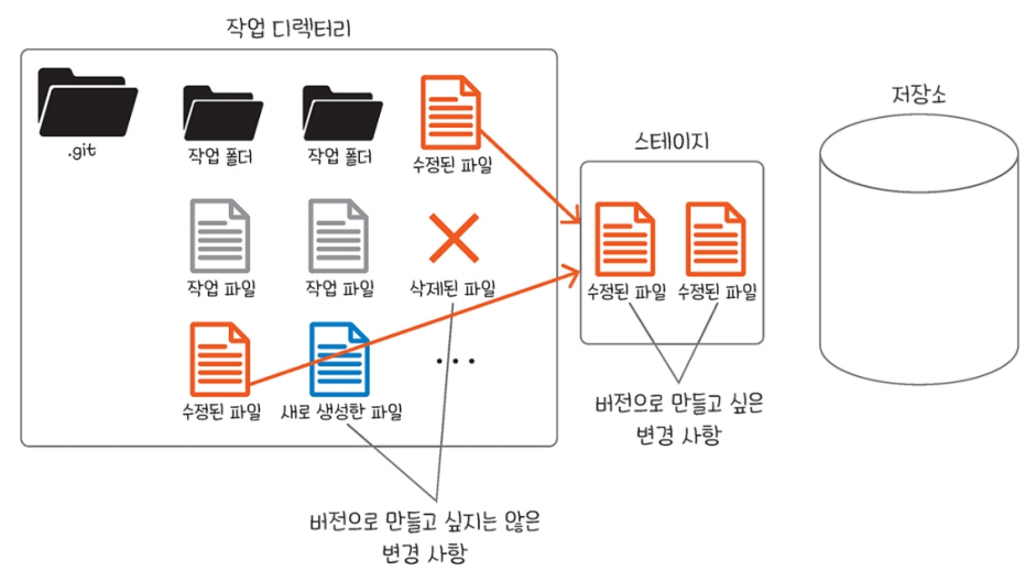 그래서 깃으로 버전을 만들 때는 작업 디렉터리 내에서 변경된 파일들 중에서 새로운 버전이 될 파일만 특별한 공간으로 옮기는 작업을 거치게 된다.