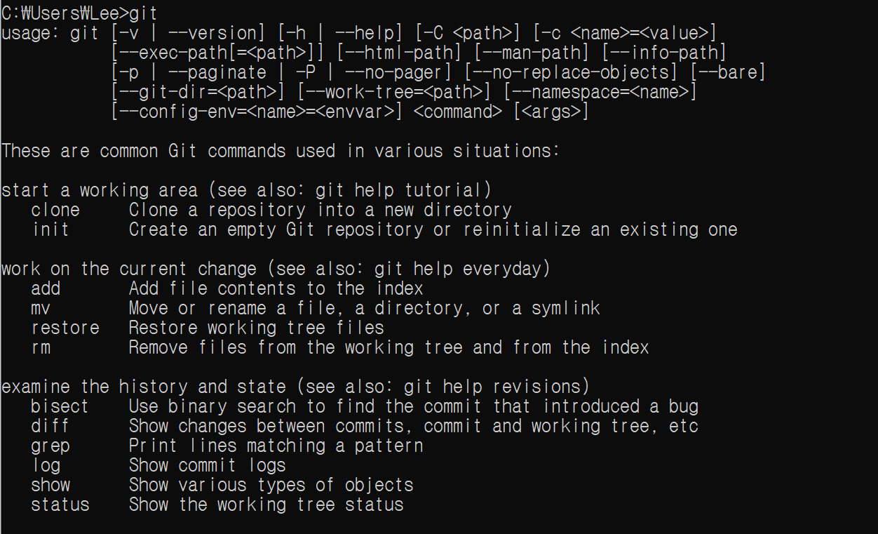 깃이 설치완료 되었다면 cmd 창에서 아래와 같이 git을 치면 잘 설치된 것이다.