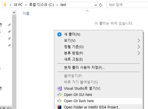 윈도우 탐색기 폴더에서 깃 배시를 누르면 아래와 같은 화면이 뜬다.