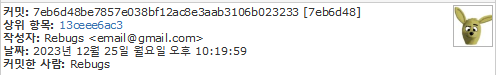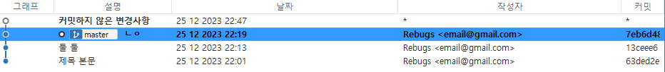 위 캡쳐 화면에서 맨 오른쪽에 있는 커밋 항목은 해시 값의 앞부분만 따놓은 것이다.