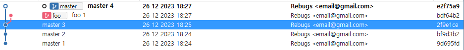 foo 브랜치가 master 브랜치의 네 번째 커밋으로 rebase 되었다.