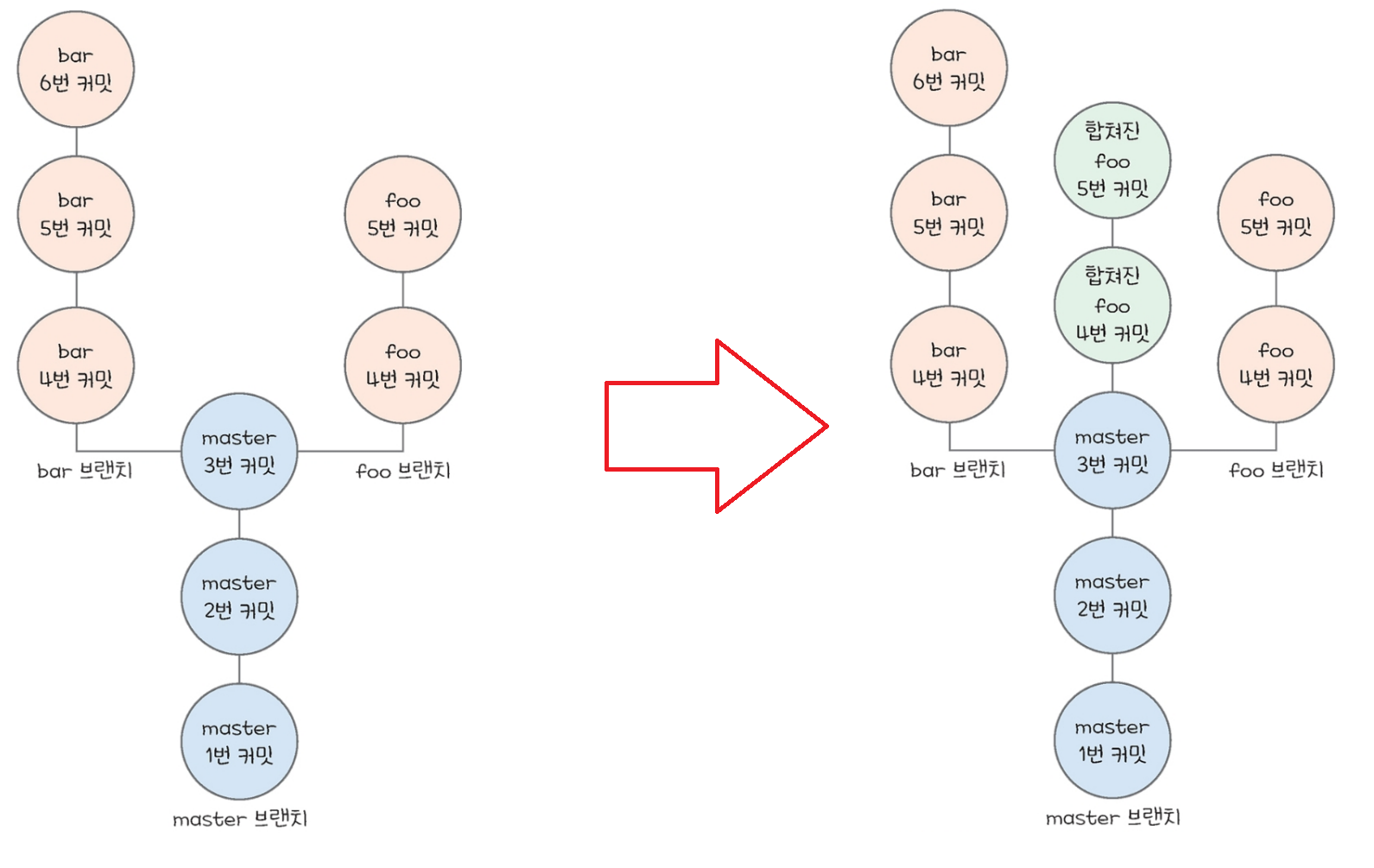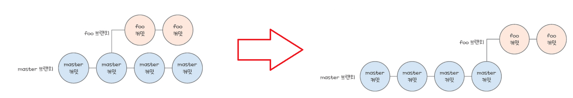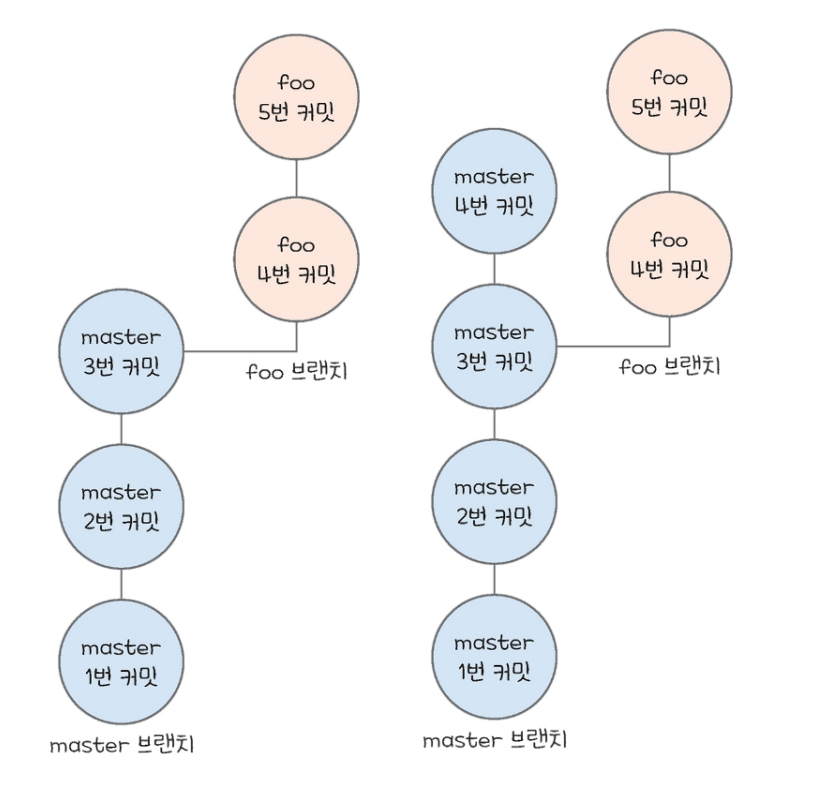 master의 최신 커밋에서 foo라는 브랜치를 만들고, foo 브랜치에 커밋을 두 개 추가하면 아래의 왼쪽과 같다.