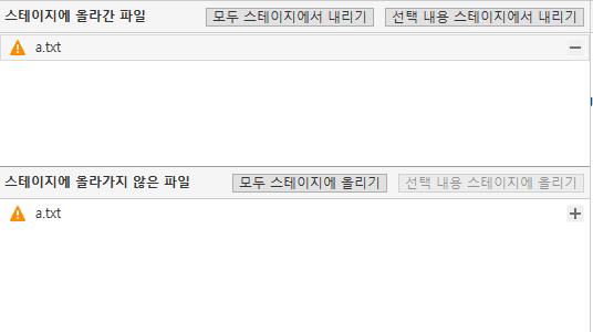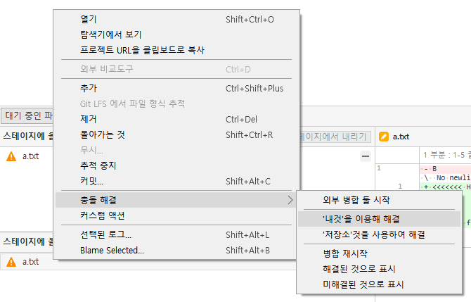 스테이지에 올라가지 않은 파일 항목에 있는 a.txt 파일에서 충돌 해결을 클릭하면 '내 것'을 이용해 해결 항목과 '저장소'것을 사용하여 해결 항목이 있다.