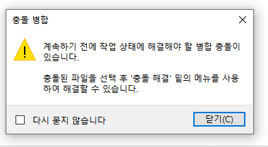이제 병합하면 아래와 같이 오류가 뜬다.