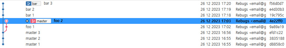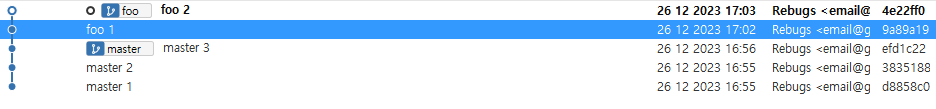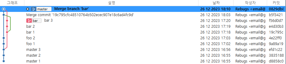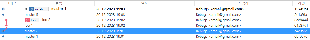 foo는 master 브랜치의 세 번째 커밋에서 뻗어 나온 브랜치이기 때문에 master 브랜치의 커밋 세 개를 모두 포함하고 있기 때문이다.