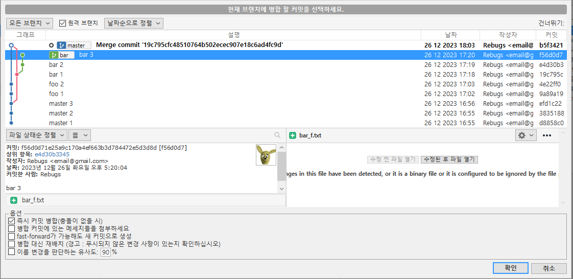 상단의 병합 버튼을 누른 후, bar 브랜치의 6번 커밋을 선택하고 확인을 누른다.